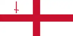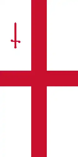 The flag of the City of London is based on the flag of England, having a centred red St George's Cross on a white background, with the red sword in the upper hoist canton (the top left quarter). The sword is believed to represent the sword that beheaded Saint Paul, who is the patron saint of the city. The tip of the sword always points upwards; therefore, when the flag is held on its side as a banner, the sword would be printed to face hoist and would be located on the left as it is hanging down (see below).