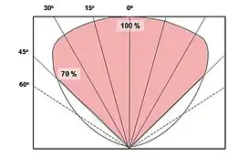 The cone of vision of a flame detector is determined by the shape and size of the window and the housing and the location of the sensor in the housing. For infrared sensors also the lamination of the sensor material plays a part; it limits the cone of vision of the flame detector. A wide cone of vision does not automatically mean that the flame detector is better. For some applications the flame detector needs to be aligned precisely to take care that it does not detect potential background radiation sources. The cone of vision of the flame detector is three dimensional and is not necessarily perfectly round. The horizontal angle of vision and the vertical angle of vision often differ; this is mostly caused by the shape of the housing and by mirroring parts (meant for the self test). Different combustibles can even have a different angle of vision in the same flame detector. Very important is the sensitivity at angles of 45°. Here at least 50% of the maximum sensitivity at the central axis must be achieved. Some flame detectors here achieve 70% or more. In fact these flame detectors have a total horizontal angle of vision of more than 90°, but most of the manufacturers do not mention this. A high sensitivity on the edges of the angle of vision provides advantages for the projection of a flame detector.