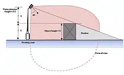 The range of a flame detector is highly determined by the mounting location. In fact, when making a projection, one should imagine in what the flame detector "sees". A rule of thumb is, that the mounting height of the flame detector is twice as high as the highest object in the field of view. Also the accessibility of the flame detector must be taken into account, because of maintenance and/or repairs. A rigid light-mast with a pivot point is for this reason recommendable. A "roof" on top of the flame detector (30 x 30 cm, 1 x 1-foot) prevents quick pollution in outdoor applications. Also the shadow effect must be considered. The shadow effect can be minimized by mounting a second flame detector in the opposite of the first detector. A second advantage of this approach is, that the second flame detector is a redundant one, in case the first one is not working or is blinded. In general, when mounting several flame detectors, one should let them "look" to each other not let them look to the walls. Following this procedure blind spots (caused by the shadow effect) can be avoided and a better redundancy can be achieved than if the flame detectors would "look" from the central position into the area to be protected. The range of flame detectors to the 30 x 30 cm, 1 x 1-foot industry standard fire is stated within the manufacturers data sheets and manuals, this range can be affected by the previously stated de-sensitizing effects of sunlight, water, fog, steam and blackbody radiation.
