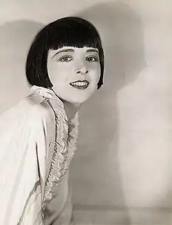 The flapper signaled the transition from the pre-World War I feminine ideals, such as the Gibson Girl, to the post-war modern era. She acted out the changes that were taking place "in fashion, sex, social awareness, and politics."[15] Basinger describes the iconic image of the flapper: "flat-chested and angular, big-eyed and lively, and with her hair cut short, very short, straight across the bottom and topped off with bangs"—the distinctive "Dutch Boy bob".[16] Basinger insists that the Dutch Boy was popularized by Colleen Moore, and not by her contemporary Louise Brooks, whose hairdo appropriates the "trademark" flapper cut.[17]