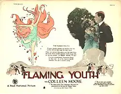 Flaming Youth is a 1923 American silent drama film directed by John Francis Dillon and starring Colleen Moore and Milton Sills, based on the novel of the same name by Samuel Hopkins Adams. Associated First National produced and distributed the film. In his retrospective essay "Echoes of the Jazz Age", writer F. Scott Fitzgerald cited Flaming Youth as the only film that captured the sexual revolution of the Jazz Age.[1] The film is now considered partially lost.[2] One 11 minute reel survives and is housed at the Library of Congress.[3][4]
