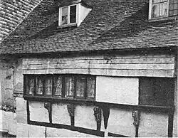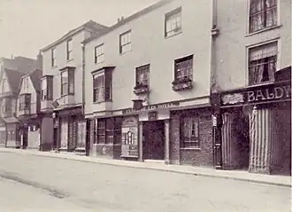 The hotel is mentioned as early as 1376. In the back of the building was a livery stable and the Fleur de Lis tap, which can be dated to 1372.[1] An engraving from 1808 on a post card shows the 13th century windows in the courtyard of the hotel with carved corbels. The same corbels can be seen in a 1895 photograph that show the back of the building next to The Cherry Tree Freehouse pub on 10 White Horse Lane.[2][1]