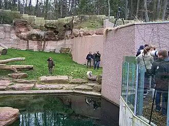 On 8 April 2008, Flocke made her first public appearance in the polar bear enclosure that had once been home to Vilma; the adult polar bear had been relocated to another zoo. The four-month-old cub was greeted by more than 160 journalists and a half-dozen international camera crews on the first day.[13] During the first week, Flocke was displayed for short intervals with breaks at midday. Expecting a peak of 20,000 visitors, the zoo built a viewing platform, capable of holding 500 people at a time, in front of the enclosure,[14] but attendance by zoo patrons was initially lower than expected.[15] The zoo uses a video transmission and recording system from Bosch Security Systems to transmit TV-quality live images of the cub to a pair of 46-inch (1,200 mm) large-format screens. This system, which includes one screen outside the enclosure, was implemented to help the zoo meet the demands of visitors wanting to catch a glimpse of Flocke.[16]