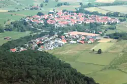 Without floods, the flood bypass (upper left corner) is dry land used for agriculture, river Lahn flows in a meander around the village Weimar Roth