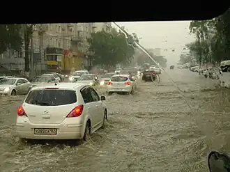 Floods in Russia occur during the spring thaw and heavy rainfall seasons, caused by snowmelt, ice jams, and intense rainstorms, particularly in the vast river basins of the Volga, Ural, Lena, Don, and Ob rivers.[1] In 2020, there were 928 floods across the country, with over 80% caused due to excessive rainfall.[2] Notable flood events include the 2001 flooding in the Sakha Republic, which caused damages of over 7 billion roubles,[3] and the 2024 floods in the Urals, which led to the evacuation of thousands of people and resulted in local damages of 21 billion roubles (approximately $227 million).[4][5]