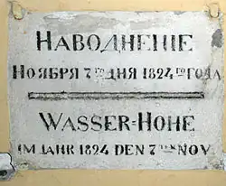 A sign of the heaviest flood in St. Petersburg (1824) at the intersection of the Cadet line and the Bolshoi Prospekt of Vasilievsky Island