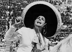Famed for her melodious voice and unique singing style, hence the nicknames "La Sentimental" ("The Sentimental One") and "La Voz Que Acaricia" ("The Voice That Caresses"), Flor Silvestre was a notable interpreter of the ranchera, bolero, bolero ranchero, and huapango genres. She recorded more than 300 songs for three labels: Columbia, RCA Víctor, and Musart. In 1945, she was announced as the "Alma de la Canción Ranchera" ("Soul of Ranchera Song"),[5] and in 1950, the year in which she emerged as a radio star, she was proclaimed the "Reina de la Canción Mexicana" ("Queen of Mexican Song").[6] In 1950, she signed a contract with Columbia Records and recorded her first hits, which include "Imposible olvidarte", "Que Dios te perdone", "Pobre corazón", "Viejo nopal", "Guadalajara", and "Adoro a mi tierra". In 1957, she began recording for Musart Records and became one of the label's exclusive artists with numerous best-selling singles, such as "Cielo rojo", "Renunciación", "Gracias", "Cariño santo", "Mi destino fue quererte", "Mi casita de paja", "Toda una vida", "Amar y vivir", "Gaviota traidora", "El mar y la esperanza", "Celosa", "Vámonos", "Cachito de mi vida", "Miel amarga", "Perdámonos", "Tres días", "No vuelvo a amar", "Las noches las hago días", "Estrellita marinera", and "La basurita", among others. Many of her hits charted on Cashbox Mexico's Best Sellers and Record World Latin American Single Hit Parade.[7] She also participated in her husband Antonio Aguilar's musical rodeo shows.