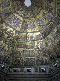 The oldest extant large scale Florentine pictorial project is the mosaic decoration of the interior of the dome of the Baptistery of St John, which began around 1225. Although Venentian artists were involved in the project, the Tuscan artists created expressive, lively scenes, showing emotional content unlike the prevailing Byzantine tradition. Coppo di Marcovaldo is said to have been responsible for the central figure of Christ and is the earliest Florentine artist involved in the project. Like the panels of the Virgin and Child painted for the Servite churches in Siena and Orvieto, sometimes attributed to Coppo, the Christ figure has a sense of volume.