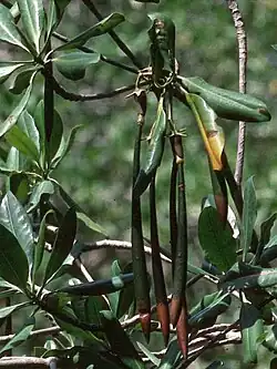 Black mangrove trees grow to a heights of 133 feet and average 66 feet. They are characterized by vertically erect aerating branches (pneumatophores) extending up to 20 cm above the soil. The bark is dark and scaly and the upper surface of the leaves is often covered with salt excreted by the plant. This tree has white flowers that are bilaterally symmetrical and pollinated by Hymenoptera; they are the source of mangrove honey. The seed is shaped and sized similar to a lima bean when germinated. Younger black mangrove trees are shade intolerant but become more shade tolerant as they mature.[1]