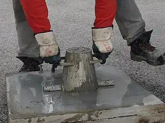 - The cone is placed in the center of the flow table and filled with fresh concrete in two equal layers. Each layer is tamped 10 times with a tamping rod.