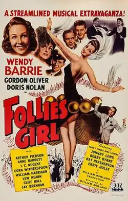 Follies Girl is a 1943 American musical comedy film directed by William Rowland and starring Wendy Barrie, Doris Nolan and Gordon Oliver. It was made by the poverty row studio Producers Releasing Corporation. Much of the film takes place in or around a burlesque house.[1] It was the final film appearance of Barrie apart from a cameo role in It Should Happen to You.