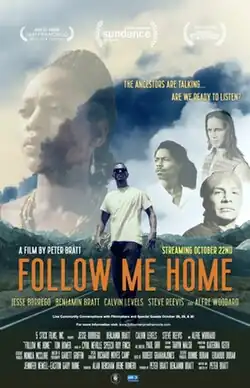 Follow Me Home is a 1996 film directed by activist and filmmaker Peter Bratt. It explores spiritual and intercultural race relations through the lives of four artists, one African American, one Native American, and two Latin-American cousins, who embark on a cross-country road trip to paint a mural on the White House. Along the way, they meet a mysterious African American woman bearing a deep secret.[1]