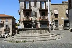 The Fontana di Piano Scarano, sometimes shortened to Fontana di Piano is a medieval fountain located in a piazza located two blocks north of Porta Carmine, inside the city walls of Viterbo, region of Lazio, Italy.