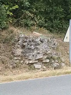 The location of the aqueduct is revealed by a linear bulge in the ground in the Beauregard Park to the east of Véretz, sometimes highlighted by a line of scrubby vegetation contrasting with the surrounding fields; the aqueduct then seems to have acted as a dike perpendicular to the slope, retaining the sediment that accumulated against it.[57] The aqueduct was found again shortly before crossing the D976, but construction work dismantled its remains.[57] The construction of houses in the town of Véretz was accompanied by the destruction of part of the aqueduct, which was used as a stone quarry,[57] but the canal remains visible in several places, its masonry exposed by landslides on the hillside. At the western end of the village, the masonry of the aqueduct was used as a lintel or step for cellar access doors at the bottom of an industrial wasteland.[58]
