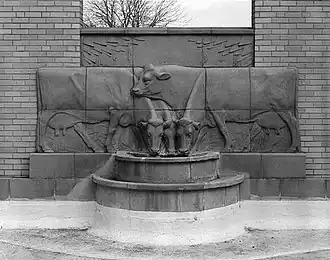 The seven courtyard bas reliefs were designed in an Iowa City workshop, and the terra cotta panels were created using a kiln designed by Paul E. Cox, a professor of ceramic engineering at what was then Iowa State College. The use of terra cotta for the panels was rare by the 1930s.[2] The central panel depicts three Jersey cows and a bull located above the basin of a semicircular double-tiered fountain that flows into a reflecting pool. The panels on the left depict the early American era of hand milking, transporting the raw milk by wagon to the market, separating milk, and butter churning. The panels on the right depict the modern (1934) dairy plant at Iowa State. They include scenes of mechanical milking machines, a "Babcock" testing machine and a power centrifugal separator, and equipment for present-day pasteurizing, cooling, and cheesemaking. Professor Martin Mortensen, who was the head of the Dairy Industry department, assisted with the portrayal of dairy technology. Professor Maurice Hanson of the landscape architecture department designed the gravel walkways and plantings in the courtyard.