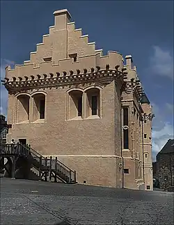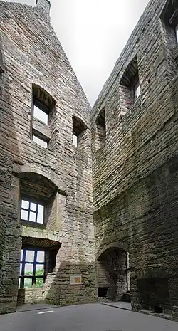 The kitchens at Linlithgow Palace are on three levels within the tower at the north end of the Great Hall. They were modified in 1464, 1470–1, and 1539. Some alterations were occasioned by subsidence. The court kitchen is adjacent to the Great Hall. The room next door was probably the spice house.[21] In August 1539 James Hamilton of Finnart was paid for rebuilding the king's kitchen with a fireplace, an oven, and a room for silver vessels, and another for keeping coal.[22] There is a well in the lower "laich" kitchen.[23]