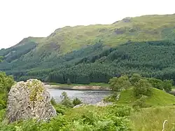 There are records of several other hunting royal trips. Much of the food was brought from elsewhere.[48] Since the 15th century there was a Hunt Hall in Glen Finglas to accommodate the royal party.[49] James IV came to the Hunt Hall in July 1492.[50] In August 1505 he was supplied with dairy goods by two women from Duntreath, and eels and pikes from the Lake of Menteith.[51] In August 1538 James V and Mary of Guise, with six ladies in waiting, went to Glen Finglas, bringing provisions bought in Stirling.[52] Mary, Queen of Scots spent three days in Glen Finglas in September 1563.[53] James V stayed at Cultybraggan near Comrie to hunt deer in September 1532, bringing bread, ale, and fish from Stirling. He frequently hunted in Glen Artney.[54]