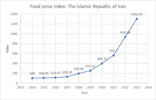 According to the world bank food security report food prices increased from April 2024 to April 2025 by 42.3% making the food inflation in the Iran the second largest in the world.[55]