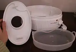 A food steamer or steam cooker is a small kitchen appliance used to cook or prepare various foods with steam heat by means of holding the food in a closed vessel reducing steam escape. This manner of cooking is called steaming.