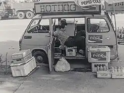 Food trucks in Thailand have unique characteristics, as the country has a long-standing culture of street food. Most commonly, food is sold from pushcarts. However, if it's sold from a vehicle, it's typically referred to as a "rot phumphuang" (รถพุ่มพวง; pronounced [rót pʰûm.pʰūaŋ]) or "rot kapkhao" (รถกับข้าว; pronounced [rót kàp.kʰâːw]), named after their distinctive appearance and function. Rot phumphuang (literally "bouquet truck") and "rot kapkhao" (literally "rice-and-dishes truck") are common terms for mobile grocery vehicles.[56] These are usually pickup trucks modified to carry and sell a variety of fresh produce, cooked food, dry goods, and household items. The name "rot phumphuang" comes from the way goods are displayed, arranged densely on racks that resemble a bouquet; "rot kapkhao" emphasizes the ready-made food aspect, as "kapkhao" means "with rice", referring to dishes commonly eaten with rice. Rot phumphuang may take the form of either a pickup truck or a motorbike with a sidecar, and they don't always sell just food, many also offer household items, shoes, and other everyday goods. Rot phumphuang can also come as a motorbike with a sidecar.[57] This business model boomed during the peak of COVID-19 pandemic.[58]