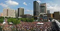 The Forecastle Festival (pronounced "fore-castle") is a three-day music, art, and activism festival held annually in Louisville, Kentucky. The festival was founded in 2002 as a small gathering of local musicians in Tyler Park, and steadily grew into an international attraction that now includes major touring acts and an economic impact of over $25 million per year.[1] Forecastle was selected as one of Rolling Stone's "Coolest Festivals"[2] and has an annual attendance of over 75,000 fans at Louisville Waterfront Park. It attracts attendees from nearly all 50 states, 2000 cities, and a dozen international countries. Past headliners include The Black Keys, Jack White, Jack Harlow, Beck, Outkast, LCD Soundsystem, Arcade Fire, Tame Impala, Tyler the Creator, Sam Smith, My Morning Jacket, Sturgill Simpson, Chris Stapleton, Alabama Shakes, the Flaming Lips, the Avett Brothers, Widespread Panic, Cage the Elephant and many more.[3]