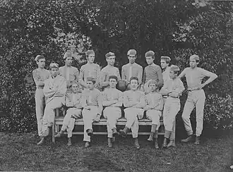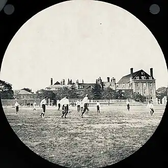 Forest had an important role in the development and creation of association football, and the Common at the front of the school may well be regarded as a "cradle of the game".[1] In the school's early years there was no sport apart from informal kick-abouts by the pupils, but by the 1840s cricket was played and hockey was in vogue in the early 1850s. Football began at Forest in 1857 when Frederick Guy took over as headmaster; it was played on The Common, at the front of the school. The Common was a rather uneven playing surface, with the great chestnut trees at the side of the pitch "in play" and some famous iron railings marking the north end of the pitch. Tradition records some great battles between Charles W. Alcock and F.J. Poole, in which the object was to barge the other player over the iron railings![2] The earliest reported match against another school was in Forest's first season on 24 February 1858, when Forest beat Chigwell School 5-4 on The Common.[3] Another early game was on Saturday 16 November 1861, when Forest School, (playing as "Walthamstow"), lost to a Westminster School side (playing as "Bounding Bricks") by three goals to nil.[4] A return match was played four weeks later, and in 1862 the school played against Old Westminsters (playing as Elizabethan Club).[5]
