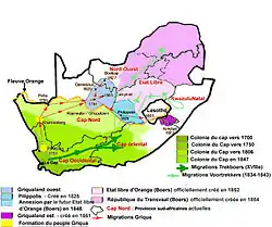 Map of South Africa showing the evolution of the borders of the Cape Colony from 1700 to 1847 as well as the migration of Griquas and Boers in the 19th century
