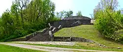 The fort's location was built up in the 1930s as a parkland development project of the Works Progress Administration. Some WPA facilities remained in use in 2014, and others had evolved into picturesque ruined structures.[2] A three-mile-long nature trail provides access to the creek ravine, WPA masonry, and the site of the vanished fort and trading post.[3][2] Part of the parkland has been set aside as a reproduction tallgrass prairie, sown with big bluestem grasses and allied species.[2] In the creekbed woods and adjacent uplands can be found the basswood, the burr oak, the chinquapin oak, and other mature-growth species of trees.[1]
