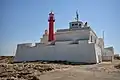Currently, the fort houses the Cabo Raso Lighthouse, and its service dependencies are used to service the lighthouse.[1] The current red-painted iron tower, adjacent to the lighthouse keepers house, dates from 1915, and its lighthouse has a range of twenty nautical miles or about 37 km.[1]