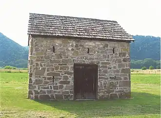 By about 1754, two years before the open outbreak of hostilities known as the French and Indian War, the family felt it necessary to build the stronger structure downstream at what came to be called Fort Van Meter. (Somewhat confusingly, the upstream settlement — known as Fort Pleasant and also listed on the NRHP since 1973 — was also long known as "Fort Van Meter". Nothing remains of the elaborate wooden stockade and blockhouse at Fort Pleasant.[6]) These structures were part of a long chain of fortifications built along the frontier of the Allegheny Mountains at that time, and especially after 1756.[7] Fort Van Meter was relatively small among these and was never garrisoned by Colonel George Washington's Virginia Regiment as there would have been no barracks to accommodate troops. However, unlike most of the others, which were wooden, it was made of stone and so has survived relatively intact to the present day.