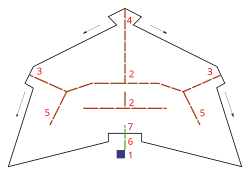 on dotted brown lines, underground routes for accessing different following buildings: ravelin (1), barracks (2), simple caponiers (3), double caponier (4), magazines (5), crane (6) and entrance to fort (7).