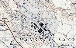 The estate is within a south-east to north-west aligned horseshoe valley (alternatively named Yarsop Valley), of 1,600 yards (1,500 m) long by 1,300 yards (1,200 m) wide, with its main entrance in Mansel Lacy. The valley bottom rises from approximately 340 feet (104 m) above mean sea level at the south-east, to 510 feet (155 m) at the Foxley Manor (remains of) north-west end. Through the estate flows a stream, interrupted by seven c.1800 or earlier man-made lakes and ponds, starting at Yarsop, entering the valley at the north, and with largely wooded margins, flowing at the north and parallel to the main valley road, past a 240 feet (73 m) by 100 feet (30 m) pond (SO4158946686), between the stream and the Foxley Manor site, then flowing at the north around the remains of the Camp, past the site of an old saw mill (SO4204546416), before passing out of the estate to lakes and ponds in Mansel Lacy village. The sides of the valley are wooded, at the south-west by Nash Wood which rises to 610 feet (190 m), and north-east by Bache Wood, rising to 790 feet (240 m). Through the valley bottom runs a road, the former processional way from the estate entrance at Mansel Lacy village, north-west to the country house and ancillary buildings of the Manor, and beyond to the estate border at a junction with the minor road running south from Yarsop at the north to the A480 road at St Mary the Virgin's church in Yazor. Opposite St Mary's (SO4066046538), is the 1887-built gatehoused north-west road to the rear of the previous Foxley Manor house, which also links to a network of woodland bridle paths within the south-west Nash Wood. From the valley road, chiefly running north-east, are access roads and tracks to remaining estate and residential buildings and, bordering both sides of the road (SO4185046420), are concrete stands indicating the position of wartime Foxley Camp structures. Between these and Bache Wood at the north is the area previously designated "The Lawns" (SO4203446660), now converted to coppicing and arable use.[1][2][3][5][6][7][8]