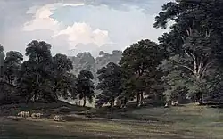Uvedale Price (1747–1829), son to Robert Price, educated at Eton and Christ Church, Oxford, continued to develop and alter the Foxley estate under the influence of his father's picturesque theories. Kim Sloan, a curator at the British Museum, states that Uvedale Price was as important an exponent of the picturesque as Richard Payne Knight, his close neighbour at Downton Castle, and the artist and cleric William Gilpin. Like his father he undertook the Grand Tour in 1768, including Switzerland. He inherited Foxley while on tour, extended the estate with lands at Mansel Lacy, Yazor and Ladylift (Lady Lift Clump, north-west from Foxley, SO3965947907), and continued its picturesque development, including his father's extension of the valley upper slope woodland plantations of oaks, chestnuts, ashes, beeches and larches, through which were six to seven miles of rides, suitable for walking and carriages, and tree management to provide and improve extensive vistas and intimate views. The castellated Ragged Castle bellevue folly in Nash Wood, which was built around 1743 by his father Robert Price, was enlarged by Uvedale Price. Foxley was described as "The noble and extensive domain... with the manors and advowsons, one of the most influential and important residential estates in the country...". His work and views were described in his three editions of An Essay on the Picturesque (1794, 1796 and 1810), a Dialogue on the distinct Characters of the Picturesque and the Beautiful (1801), Sir Uvedale Price on the Picturesque (1842), and in the 1822 edition of John Claudius Loudon's Encyclopædia of Gardening. Uvedale Price, who was High Sheriff of Herefordshire in 1793, was an acquaintance of William Wordsworth and friends with Charles James Fox and Sir George Beaumont. Sir Thomas Lawrence painted portraits of Price, and Sir Joshua Reynolds painted his wife, Lady Caroline (Carpenter), who was daughter to George Carpenter, 1st Earl of Tyrconnel. He was created a baronet in 1828, and died in 1829 aged 82. During the time of Uvedale price, the house of Foxley Manor was described as "suitable for a large establishment and family of wealth and distinction", and included an inner hall, dining room, billiard room, library, study, a suite of grand rooms, a drawing room, breakfast room, bedrooms, dressing rooms, servants quarters, and housekeeper and butler rooms. The estate contained more than three farmhouses, and water mill for corn, blacksmith and wheelwright shops, and workers' cottages. Parts of the estate had begun to be mortgaged by 1818.[8][16][20][23][24]