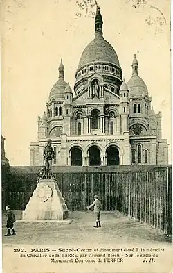 The Freemasons of the Grand Orient of France and other organized freethinkers obtained the elevation of the first Chevalier de la Barre statue in Paris as "the antidote in front of poison" to the Basilica of the Sacred Heart of Jesus of Paris (Sacré-Cœur) on Montmartre during 1897.[7] The Municipal Council of Paris during 1904 recovered 5000 m2 of land wrongfully retained by the archdiocese and decided to award a 5,000-franc grant toward the completion of the statue at this location in line with the great portal of the Sacré-Cœur, Paris.[7][8]