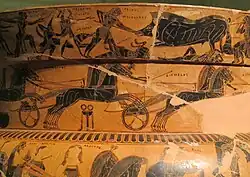 The second band on side A shows the chariot race which is part of the funeral games for Patroclus, instituted by his friend Achilles, in the last year of the Trojan War. Here, Achilles is standing in front of a bronze tripod, which would have been one of the prizes, while the participants include the Greek heroes Diomedes and Odysseus. On side B, the painted scene depicts a battle of the Lapiths and Centaurs. The most famous of these conflicts took place at the wedding party of Pirithous and Hippodamia, which is probably depicted here, as the hero Theseus is found among the combatants, a friend of Pirithous who himself was not a Lapith, but said to be among the wedding guests. The scene also includes the demise of the Lapith hero Caeneus.