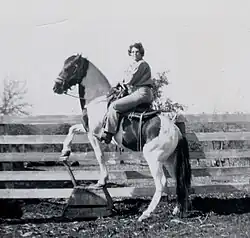 Frances Kallison mounted on her horse Bill practicing trick riding, circa 1943