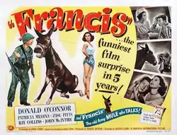 Francis is a 1950 American comedy film from Universal-International that launched the Francis the Talking Mule film series. Francis is produced by Robert Arthur and directed by Arthur Lubin, and stars Donald O'Connor and Patricia Medina. The distinctive voice of Francis is a voice-over by actor Chill Wills.