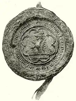 At the end of the year, Szécsényi went on a pilgrimage to the Holy Land, lasted until spring 1396.[6] He was escorted by former vice-voivode Bartholomew Szobi, who was granted five villages in Somogy County by his travel companion after their homecoming in May 1396.[19] When Sigismund and his royal army left the kingdom for the Crusade of Nicopolis, Szécsényi served as one of the six members of the appointed regent council – along with Master of the treasury Nicholas Kanizsai, Judge royal John Pásztói, comes Stephen Lackfi, Voivode of Rus' John Kaplai and his brother Desiderius Kaplai.[6] Sigismund suffered a catastrophic defeat at Nicopolis. The disaster angered several Hungarian lords, leading to instability in the kingdom. After the emergence of the Kanizsai League and the killing of Stephen Lackfi and his followers in the Bloody Sabor of Križevci, Sigismund appointed his most loyal men to the court dignities, including Szécsényi, who became Judge royal in November 1397. He held the office for eleven years until his death.[20] He was one of the three barons, who stand as a guarantor for the pledged fortune of the Jolsvai family, who tried unsuccessfully to redeem and extricate Leustach Jolsvai, former Palatine of Hungary, who had fallen into Ottoman captivity in the Battle of Nicopolis.[21] In 1401, Szécsényi participated in the conspiracy against Sigismund, who was imprisoned once and deposed twice in those turbulent months. After that he was pardoned and swore loyalty to the king again. Soon he joined the Siklós League, composed of the Garai and Cillei families, who supported Sigismund.[6]