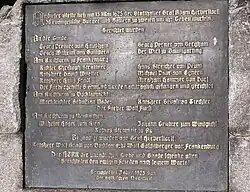 The Bavarian governor in the region above the Enns, Count Adam von Herberstorff, also promised mercy when he summoned all the male inhabitants of the county to Haushamerfeld, situated between Frankenburg and Vöcklamarkt, on 15 May to hold court over the rebels. A total of about 5,000 men were rounded up there, among them the 36 suspected ringleaders of the Frankenburg uprising. These were shielded by Bavarian soldiers and told by Herberstorff that they were sentenced to death. Herberstorff, however, had half of them "pardoned", for which he had the 36 concerned thrown dice for their lives in pairs.[1][3][4] 16 losers of the ensuing dice game were hanged, and two other losers were pardoned. A dyeing helper was later caught and also hanged so that a total of 17 men were judged.