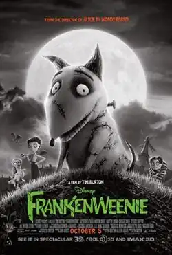 Frankenweenie, which was both the first black-and-white feature-length film and the first stop-motion film to be released in IMAX 3D,[5] premiered at Fantastic Fest on September 20, 2012, and was released in the United States on October 5, to generally positive reviews for its visuals and story and moderate box office returns, grossing $81.5 million worldwide against a $39 million budget. It won the Saturn Award for Best Animated Film, and was nominated for an Academy Award, a Golden Globe, a BAFTA, and an Annie Award for Best Animated Film, losing the first three to Brave, and the last one to Wreck-It Ralph.[6][7][8][9]