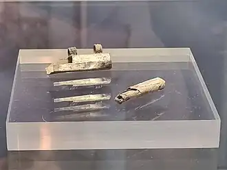 Among the burials was a man aged approximately 35 to 45.[8] Beneath his chin, archaeologists found a silver amulet capsule measuring 35 mm (1.4 in) in length and 9 mm (0.35 in) in width. Inside the capsule was a rolled, folded, and crumpled silver foil, 91 mm (3.6 in) long. Based on burial goods, including an incense burner and a mug made of baked clay, the burial was dated to between 230 and 270.[9][7][8][a] Isotopic analysis of the remains, aimed to determine the man's origins, are underway; however, as of 2024, the results of that analysis are pending.[3]
