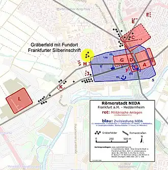 Map of Roman fortifications (red) and civilian settlements (blue) in Nida. The inscription was found at a burial site on Heilmannstraße (yellow circle).