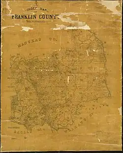 In 1915 the approximate rateable value of the county was £3,500,000.[2] In 1923 Franklin County covered 620 sq mi (1,600 km2) and had a population of 9,730, with 183 mi (295 km) of gravel roads, 252 mi (406 km) of mud roads and 400 mi (640 km) of tracks.[3]