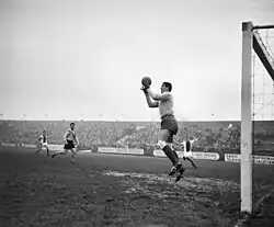 4. ^ "Frans de Munck — De Zwarte Panter; De "Rare" geschiedenis van een doelverdediger" [Frans de Munck – The Black Panther; The "strange" history of a goalkeeper]. Nieuwe Courant. 4 August 1949. Retrieved 29 January 2018 – via Delpher. Zijn heroïeke gestalte verschafte hem op zestienjarige leeftijd een plaats onder de lat in het eerste elftal van zijn stad Goes. Een triomftocht begon. De Munck verscheen op de Zeeuwse en Midden-West-Brabantse velden. Hij werkte ijverig aan het droompaleis van Goes, een vaste stoel in de eerste klasse. Ofschoon tweemaal kampioen van de afdeling; de promotiewedstrijden leverden niet de punten op om hogerop te komen.