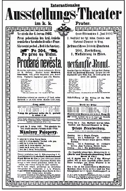 In terms of international promotion, Šubert was thinking in a broader visionary framework and he was not afraid to risk. Invited by arts patron and music lover, Princess Pauline von Metternich, he was able to take advantage of a once-a-lifetime chance and organized a presentation of several Czech shows at the International Music and Theatre Exhibition (Wiener Musik- und Theaterausstellung) in Vienna in 1892 - a project many Czech representatives found too expensive or too risky. In a competition of Eleonora Duse starring in A Doll's House or Antony and Cleopatra, Comédie-Française or Deutsches Theater, also present at the exhibition, they didn't hope to draw any attention. ”The Czechs arrived in Vienna as underdogs. The ensemble members traveled in second- and third-class train to minimize the financial risk.”[21] But the success of Czech theatre representation was immediate and immense, especially of Bedřich Smetana's opera The Bartered Bride, presented for the first time in Vienna. The reviewers found Smetana's music dynamic, and the libretto topical and poignant (not historic or allegorical as in many other operas). Next to two planned performances, two more had to be added to satisfy the enthusiasm of exhibition goers for the Czech opera. Another performance of the opera were Smetana's Dalibor and Dimitrij by Antonín Dvořák, Zdeněk Fibich's first part of his Hippodamia trilogy and Tchaikovsky's lyric opera Eugene Onegin opened in Prague in 1888 - all works unknown to wider music lovers west of the kingdom of Bohemia.