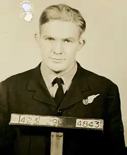 De Belin joined the Royal Australian Air Force as part of the Empire Air Training Scheme.[8] He spent some months in the summer and autumn of 1942-43 training on the airfields of Temora and Cootamundra. At Temora he was to be a pilot but transferred to the Air Observers School at Cootamundra to train as a navigator.[6] He received further training in Canada – changing course to the specialized role of ‘bomb aimer‘. He was then transferred to England and into action. He flew the maximum number of 30 bombing missions over Germany, in a Lancaster named "H of Harry", rising to the rank of Flying Officer.[6] His sorties targeted enemy munitions factories and other sites of military importance.[4]