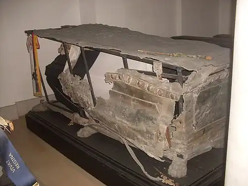 Dieter Brozat reported in "Der Berliner Dom und die Hohenzollerngruft" (1985) that the sarcophagus of Frederick William II in the Hohenzollern vault was heavily damaged during World War II. This is attributed to Soviet looting, and incendiary bomb damage.[20] During the reconstruction of the cathedral, parts of a skeleton were found, suggesting embalming of the body. Brozat believes these remains to be those of Frederick William II.