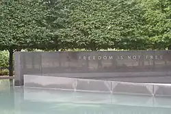 "Freedom Is Not Free" is engraved into one wall at the Korean War Veterans Memorial, Washington, D.C. There is a reflective pool in front of the memorial.[8]