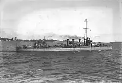 Chasseur was ordered from Chantiers et Ateliers Augustin Normand and was launched from its Le Havre shipyard on 20 February 1909. The ship was completed in November 1909.[4] When the First World War began in August 1914, Chasseur was assigned to the 3rd Destroyer Flotilla (3e escadrille de torpilleurs) of the 1st Naval Army (1ère Armée Navale).[Note 1] During the preliminary stages of the Battle of Antivari on 16 August, the 1st, 4th and 5th Destroyer Flotillas were tasked to escort the core of the 1st Naval Army while the 2nd, 3rd and 6th Flotillas escorted the armored cruisers of the 2nd Light Squadron (2e escadre légère) and two British cruisers. After reuniting both groups and spotting the Austro-Hungarian protected cruiser SMS Zenta and the destroyer SMS Ulan, the French destroyers played no role in sinking the cruiser, although the 4th Flotilla was sent on an unsuccessful pursuit of Ulan. Having broken the Austro-Hungarian blockade of Antivari (now known as Bar), Vice-Admiral (Vice-amiral) Augustin Boué de Lapeyrère, commander of the 1st Naval Army, decided to ferry troops and supplies to the port, escorted by the 2nd Light Squadron and the 1st and 6th Destroyer Flotillas while the rest of the 1st Naval Army bombarded the Austro-Hungarian naval base at Cattaro, Montenegro, on 1 September. Four days later, the fleet covered the evacuation of Danilo, Crown Prince of Montenegro to the Greek island of Corfu. The flotilla escorted multiple small convoys loaded with supplies and equipment to Antivari, beginning in October and lasting for the rest of the year, always covered by the larger ships of the Naval Army in futile attempts to lure the Austro-Hungarian fleet into battle.[6]