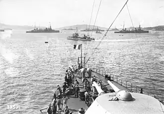 Fanfare (at the center of the picture), between battleships during an exercise near Toulon in May 1914.